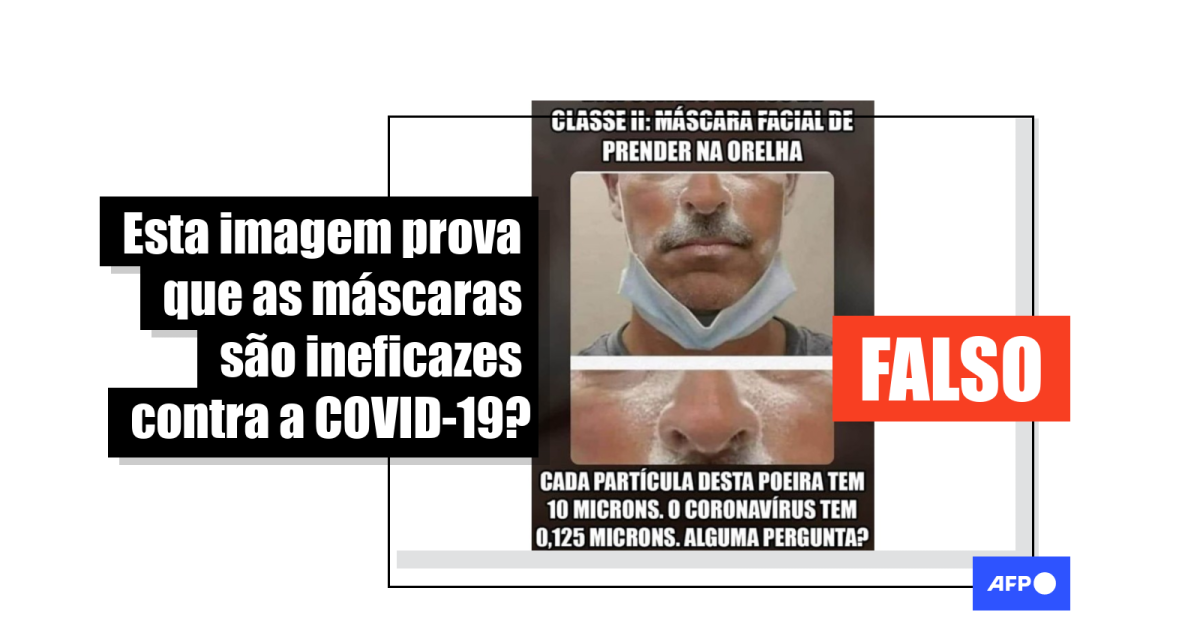 “Dispositivo médico de classe II: máscara facial de prender na orelha. Cada partícula desta poeira tem 10 microns. O coronavírus tem 0,125 microns. Alguma pergunta?”, diz um meme compartilhado mais de 500 vezes no Facebook (1, 2, 3) e no Twitter desde o último dia 25 de julho.