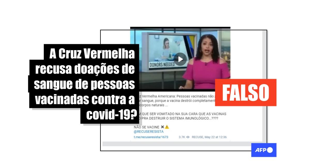 A confusão parece ter sido desencadeada pela reportagem que acompanha as publicações viralizadas. No vídeo, a apresentadora afirma, em inglês: “A Cruz Vermelha diz que qualquer um que recebeu uma vacina contra a covid-19 não pode doar plasma convalescente para ajudar outros pacientes de covid-19 em hospitais”.