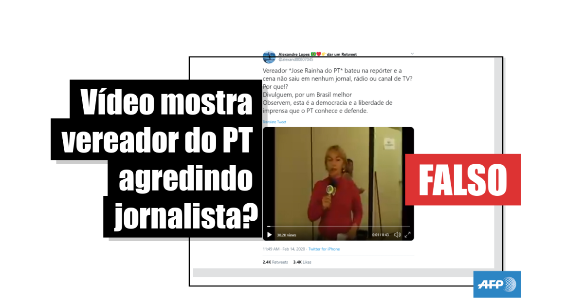 “Vereador *Jose Rainha do PT* bateu na repórter e a cena não saiu em nenhum jornal, rádio ou canal de TV? Por que!? Divulguem, por um Brasil melhor. Observem, esta é a democracia e a liberdade de imprensa que o PT conhece e defende”, diz um tuíte, replicado mais de 2.400 vezes desde 14 de fevereiro.
