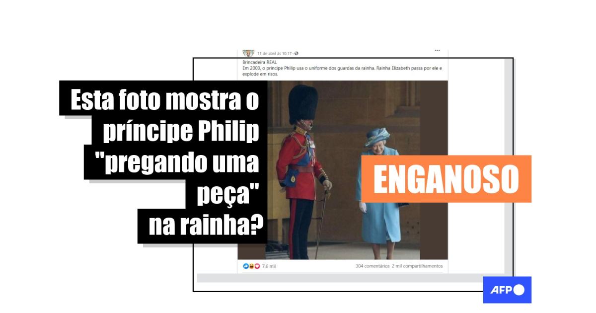 “Brincadeira REAL Em 2003, o príncipe Philip usa o uniforme dos guardas da rainha. Rainha Elizabeth passa por ele e explode em risos”, diz o texto de uma das publicações compartilhadas no Facebook (1, 2, 3) e no Twitter.