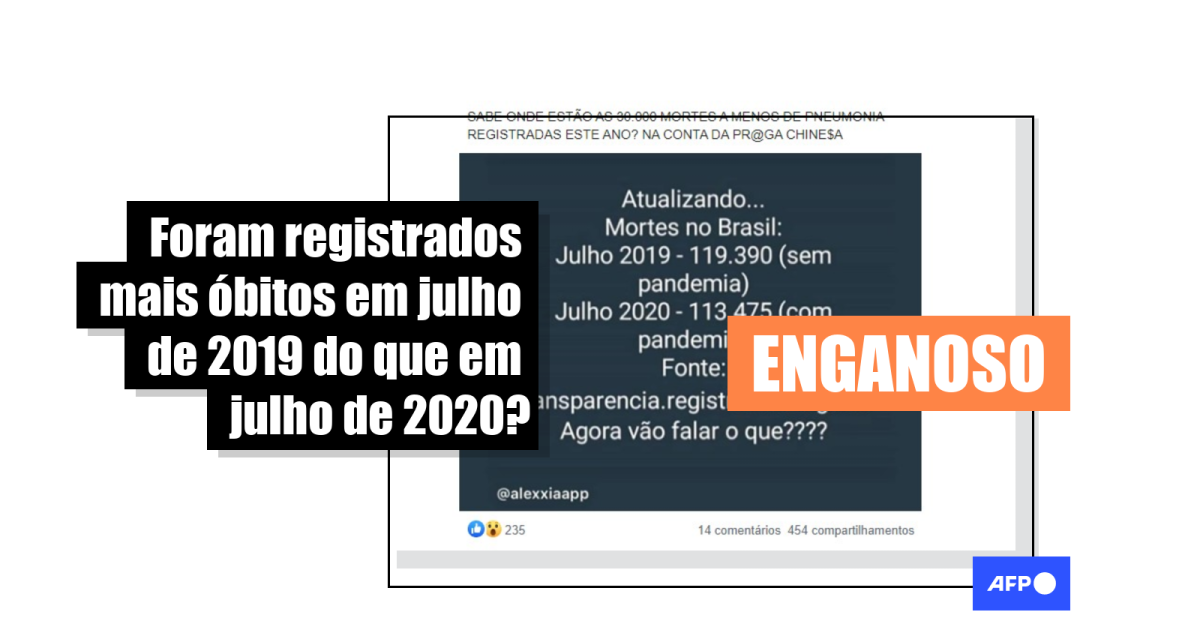 “Atualizando… Mortes no Brasil: Julho 2019 - 119.390 (sem pandemia) . Julho 2020 - 113.475 (com pandemia). Fonte: transparencia.registrocivil.org.br… Agora vão falar o que????”, diz texto compartilhado mais de 4.500 vezes no Facebook (1, 2, 3), Instagram e Twitter desde o último dia 3 de agosto.