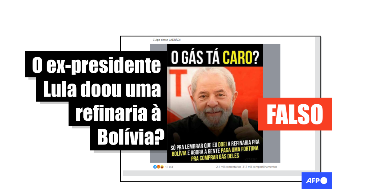 “O gás tá caro? Só pra lembrar que eu doei a refinaria pra Bolívia e agora a gente paga uma fortuna pra comprar gás deles”, indica o texto que acompanha uma fotografia do ex-presidente Luiz Inácio Lula da Silva (2003-2011), compartilhado milhares de vezes no Facebook (1, 2, 3) desde janeiro de 2018.
