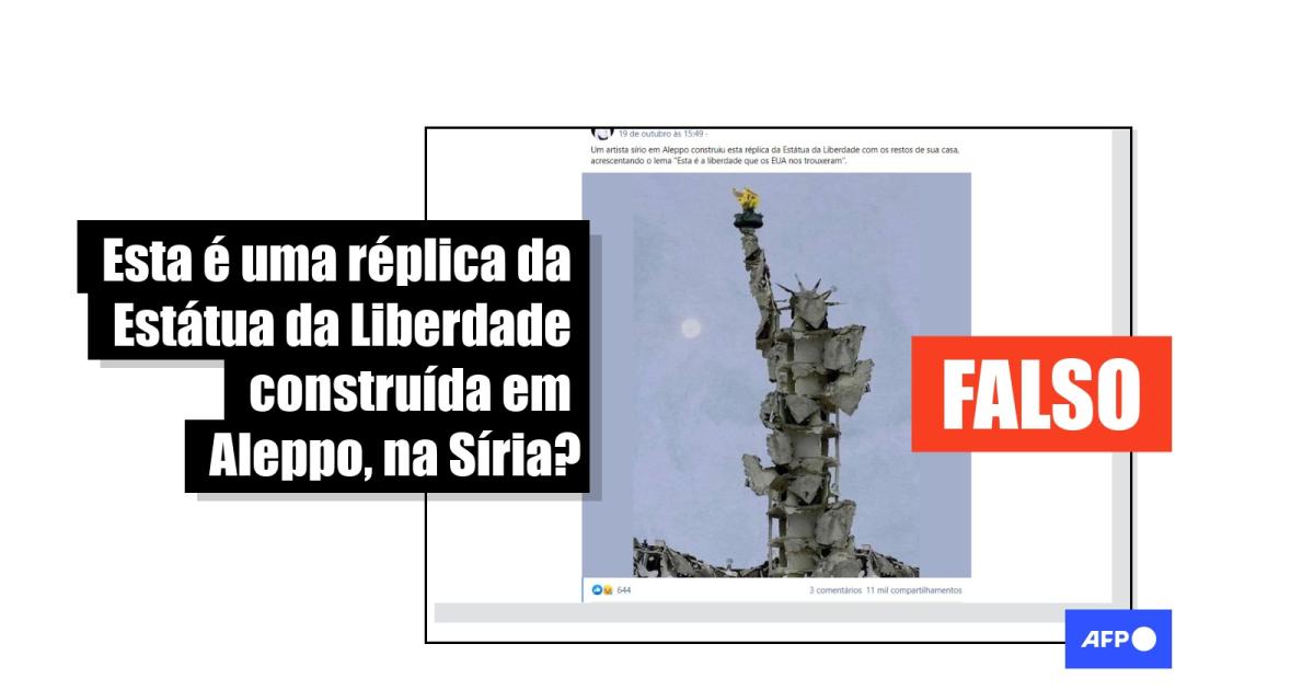 “Um artista sírio em Aleppo construiu esta réplica da Estátua da Liberdade com os restos de sua casa, acrescentando o lema ‘Esta é a liberdade que os EUA nos trouxeram’”, diz a legenda de publicações compartilhadas no Facebook (1, 2, 3) e no Twitter (1, 2) em outubro de 2021.