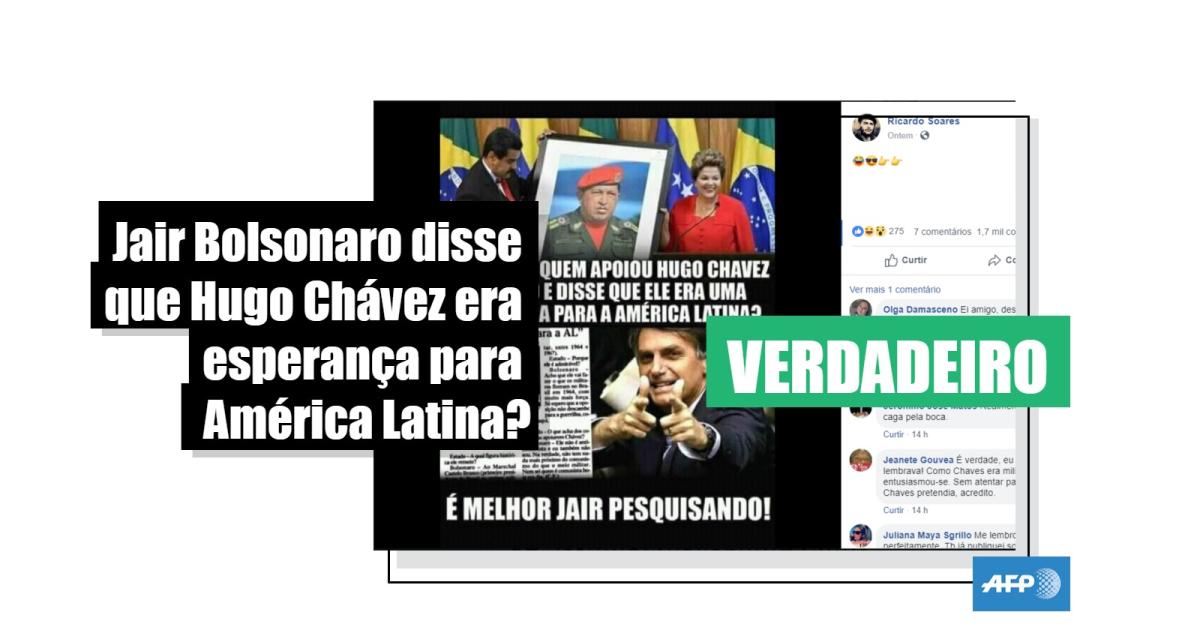 A combinação de imagens, com frases como “Você sabe quem apoiou Hugo Chávez em 1999 e disse que ele era uma esperança para a América Latina?” e “É melhor ‘Jair’ pesquisando”, foi compartilhada mais de 1.700 vezes desde a sua publicação no Facebook, em 26 de fevereiro de 2019.