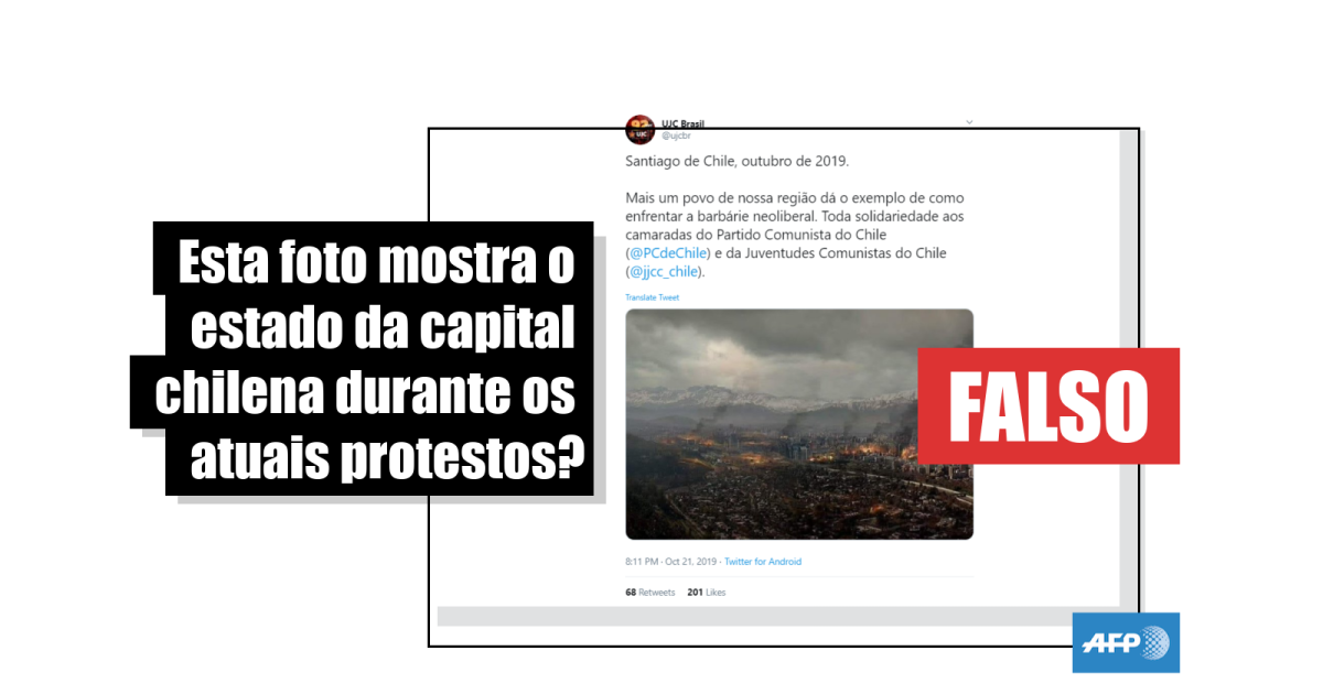 “Santiago de Chile, outubro de 2019. Mais um povo de nossa região dá o exemplo de como enfrentar a barbárie neoliberal”, diz a legenda de uma das publicações em português. “Chile em chamas: Santiago arde em rebeldia”, escreveu outro usuário ao compartilhar a imagem.