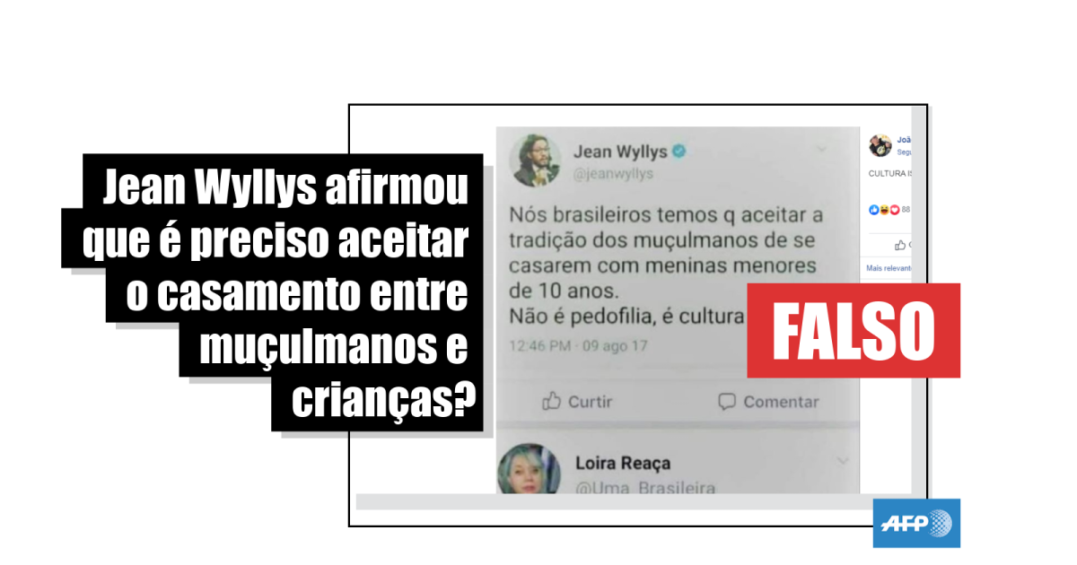 “Nós brasileiros temos q [que] aceitar a tradição dos muçulmanos de se casarem com meninas menores de 10 anos. Não é pedofilia, é cultura islâmica”, diz o tuíte, atribuído a Jean Wyllys em publicações (1, 2, 3) compartilhadas mais de 3.500 vezes no Facebook em janeiro deste ano.