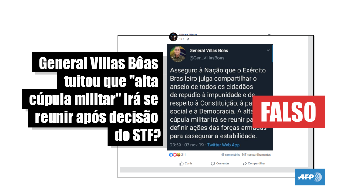 A captura de tela viralizada não possui, além disso, o símbolo azul de verificação do Twitter, que autentifica contas de autoridades e figuras públicas, como a do ex-comandante.