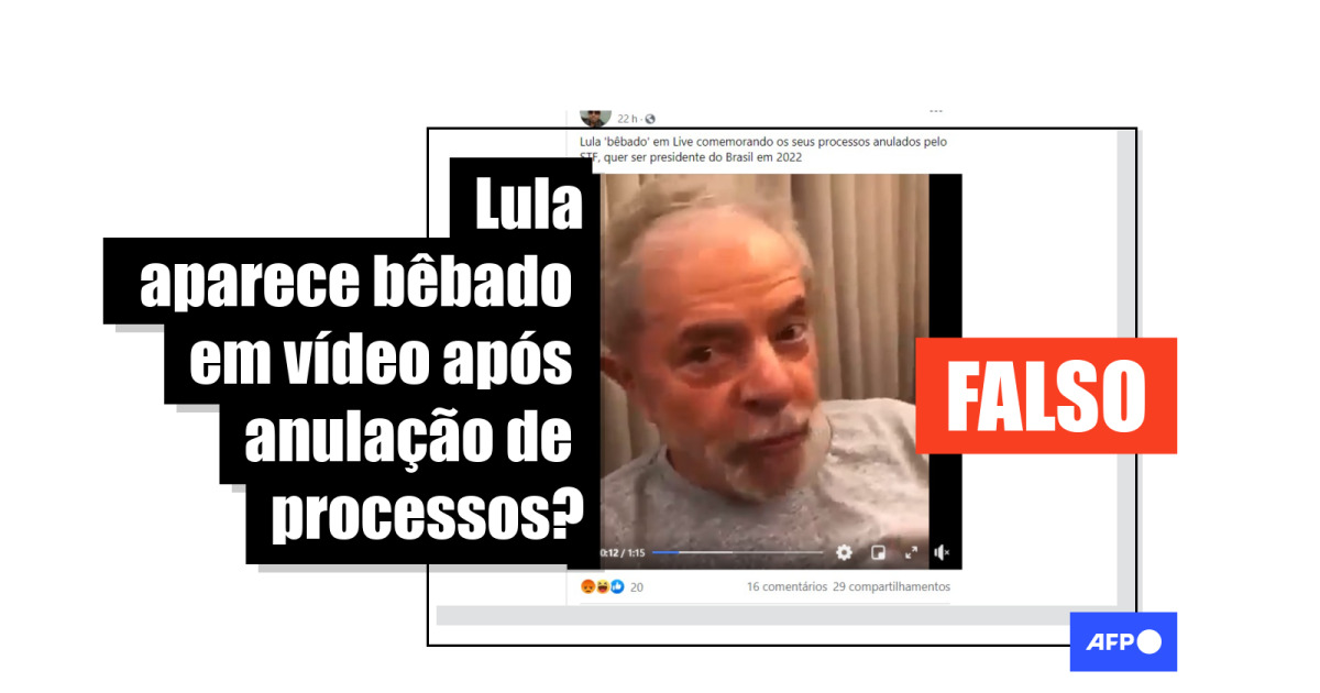 “Lula 'bêbado' em Live comemorando os seus processos anulados pelo STF, quer ser presidente do Brasil em 2022”, diz uma das publicações compartilhadas no Facebook (1, 2), no Instagram e no YouTube (1, 2).