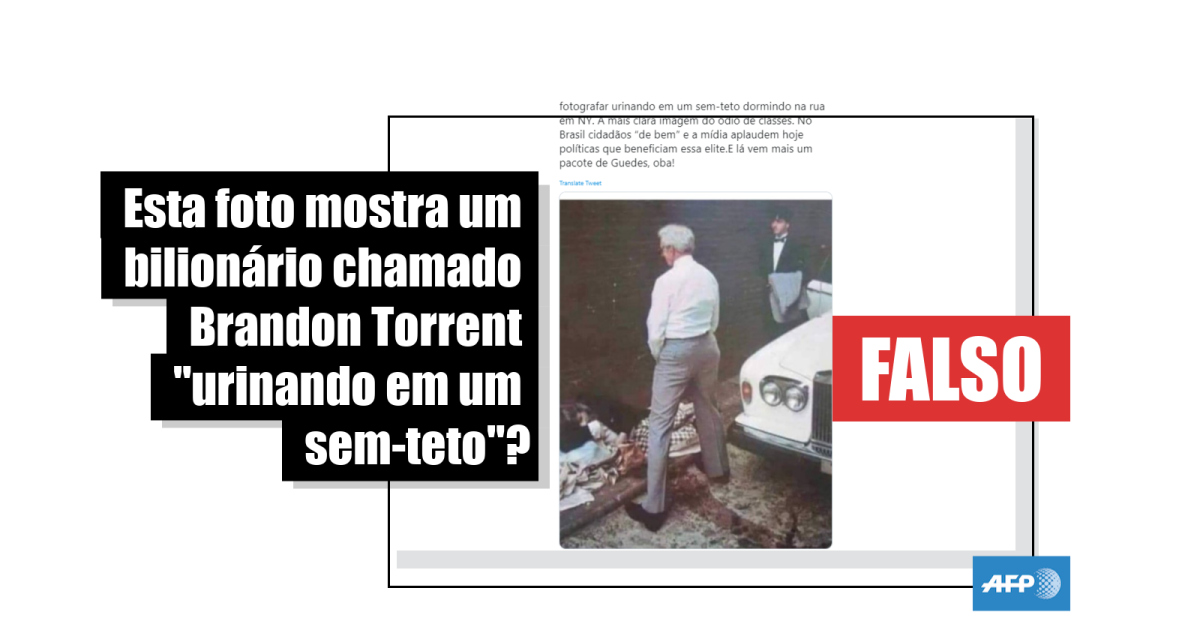Em resumo, é falso que a imagem viralizada mostre um bilionário chamado Brandon Torrent urinando em um morador de rua. A fotografia foi montada com atores para ilustrar um pôster satírico em 1983, como contou à AFP um de seus criadores, o escritor norte-americano David Gessner. Não há, ainda, qualquer registro de um bilionário que atenda por este nome.