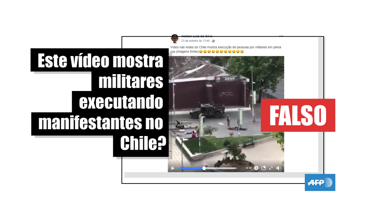 “Vídeo nas redes do Chile mostra execução de pessoas por militares em plena rua (imagens fortes)”, diz o título de um artigo compartilhado mais de 1.200 vezes no Facebook desde 22 de outubro, segundo a ferramenta Crowdtangle.
